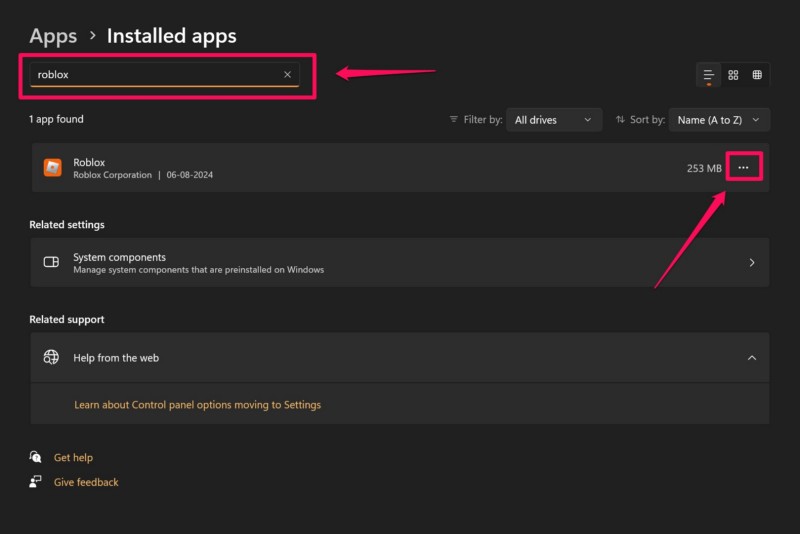 3. Użyj powyższego paska wyszukiwaniazlokalizowaćAplikacja Robloxi kliknijPrzycisk przepełnienia (trzy kropki)za to.