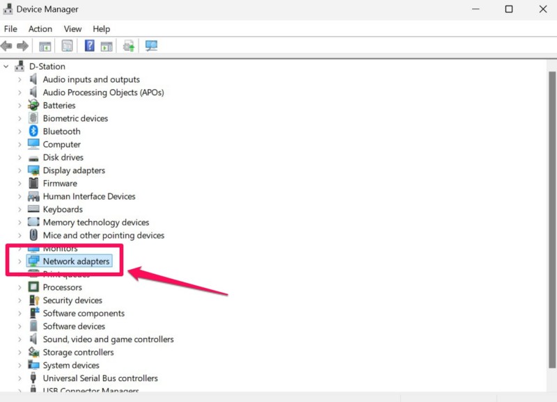 3.ZnajdźAdaptery sieciowesekcja w oknie menedżera urządzeń iKliknij strzałkę, aby ją rozwinąć.