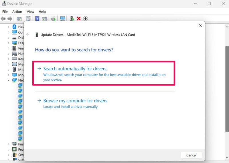 6.Pozwól Windows automatycznie pobrać i zainstaluj najnowszą wersję sterownika sieciowego.
