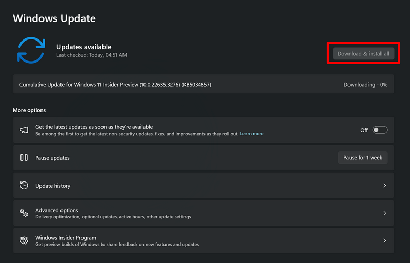 4.Po dostępnych aktualizacjach powinny one zacząć pobierać automatycznie. Jeśli nie, kliknijPobierz i zainstaluj wszystkie przycisk.