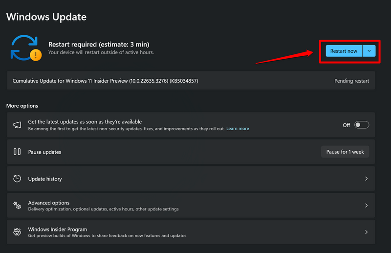 6.Po pobraniu kliknijPrzycisk restartuAby zainstalować i zastosować aktualizacje na komputerze Windows 11 lub laptopie.