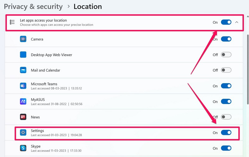 4.Kiedy jesteś przy tym, włączPozwól aplikacjom uzyskać dostęp do Twojej lokalizacjiopcja i upewnij się, że przełączUstawieniajest włączony na liście.