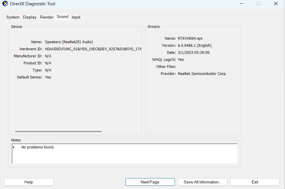 3.Po zakończeniu przejdź doDźwiękzakładkaNarzędzie diagnostyczne DirectXokno i sprawdźNotatkiobszar. JeśliNotatkisekcja wspomina o jakimś problemie, wyszukaj go w Internecie i napraw. Trzeba też udać się doAudiozakładce okna i sprawdź tam to samo.