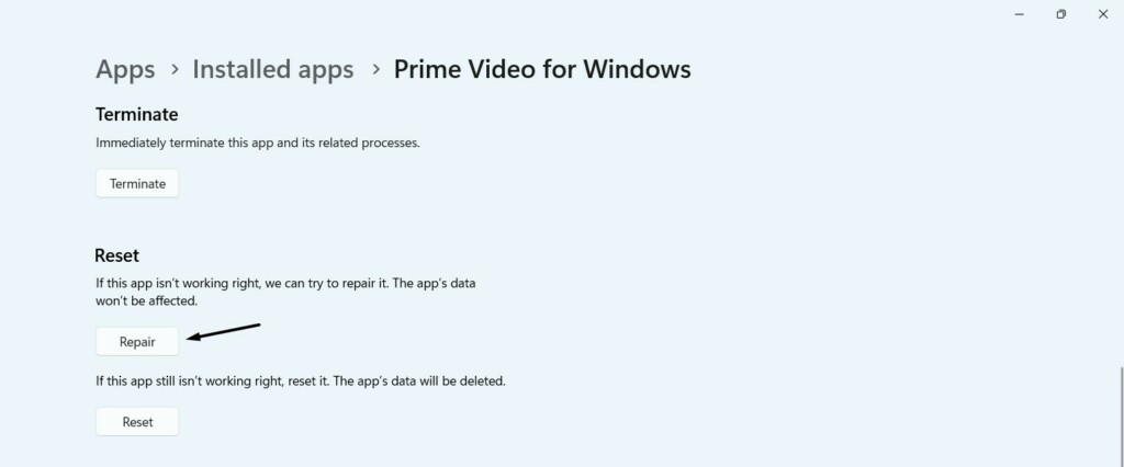 4.Idź doNastawićsekcję, a następnie kliknij przyciskNaprawaprzycisk, aby rozwiązać problemy z aplikacją Skype.