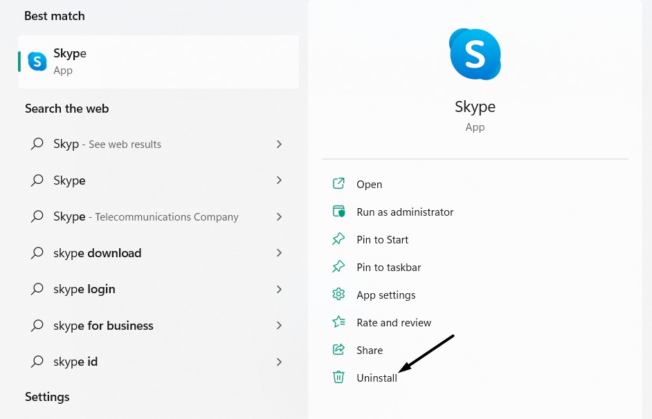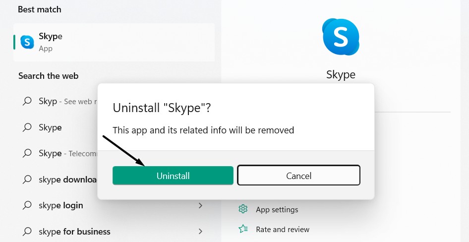 1.WyszukajAplikacja Skypekorzystając z wyszukiwania systemu Windows i kliknij przyciskOdinstalujprzycisk w wynikach.