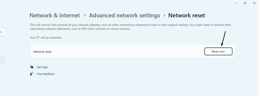 2.KliknijZresetuj terazprzycisk obokReset siecia następnie kliknijTakprzycisk w monicie.