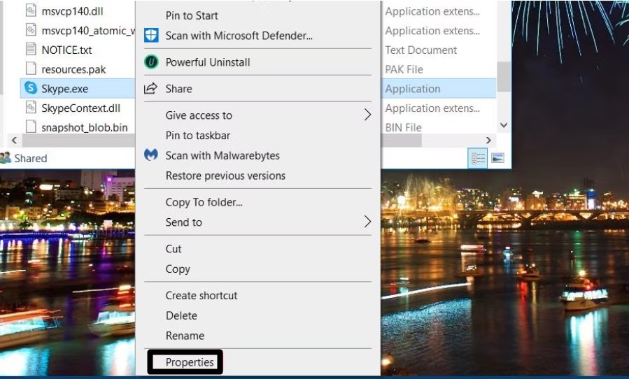 C:Program FilesWindowsAppsMicrosoft.SkypeApp_15.92.3204.0_x86__kzf8qxf38zg5cSkype2.Gdy już tam będziesz, kliknij prawym przyciskiem myszyAplikacja Skypei wybierzWłaściwościz menu kontekstowego.