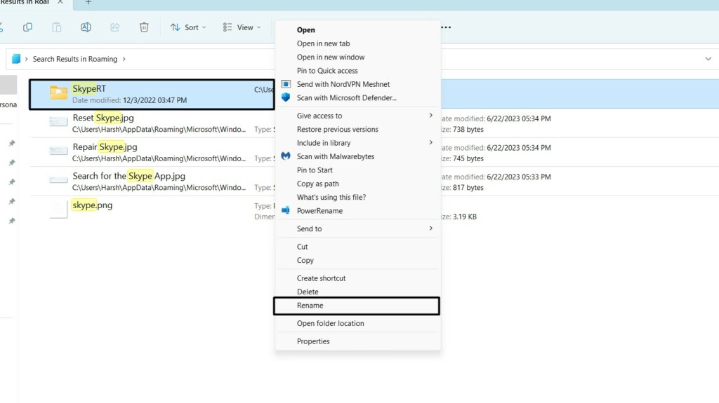 3.wRoamingfolderze, kliknij prawym przyciskiem myszyDane Skype'ai wybierzPrzemianowaćz menu kontekstowego.