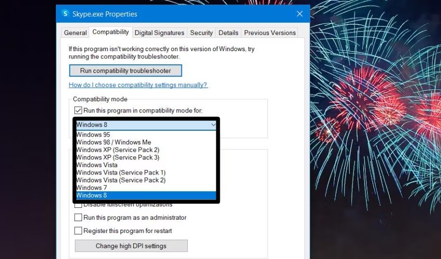 4.WybierzWindows 8opcję z menu rozwijanego w plikuTryb zgodnościsekcja.