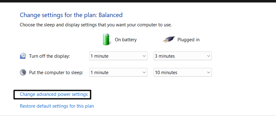 3.Na koniec kliknij przyciskZmień plan zasilaniaopcję i ustaw timer naNa bateriiIPodłączonyopcje wUśpij komputersekcja.