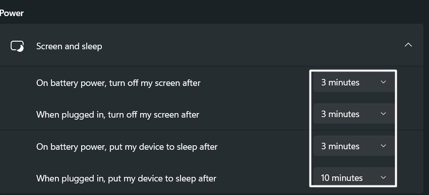 3.Wreszcie wEkran i sensekcji, upewnij się, że każda opcja ma przypisany czas. Jeśli nie, przypisz licznik czasu do każdej opcji. Spowoduje to włączenie trybu uśpienia na komputerze z systemem Windows 11 w ciągu kilku sekund.