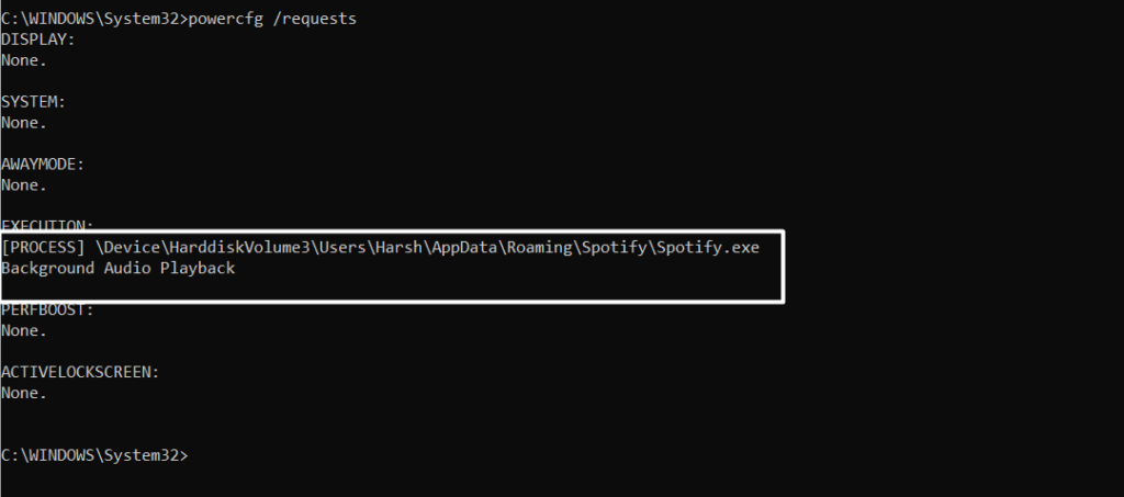 3.Po uruchomieniu powyższego polecenia zobaczysz procesy wielu programów w obszarzeWYŚWIETLACZ, TRYB AWAYMODE, WYKONANIE, PREFBOOST,IAKTYWNY EKRAN BLOKADYsekcje. Przede wszystkim musisz sprawdzić procesy w ramachTRYB POZARODUsekcję i spróbuj zidentyfikować źródło procesu. Na przykład w naszym przypadku pokazuje ten proces, który jest tworzony przez aplikację Spotify.