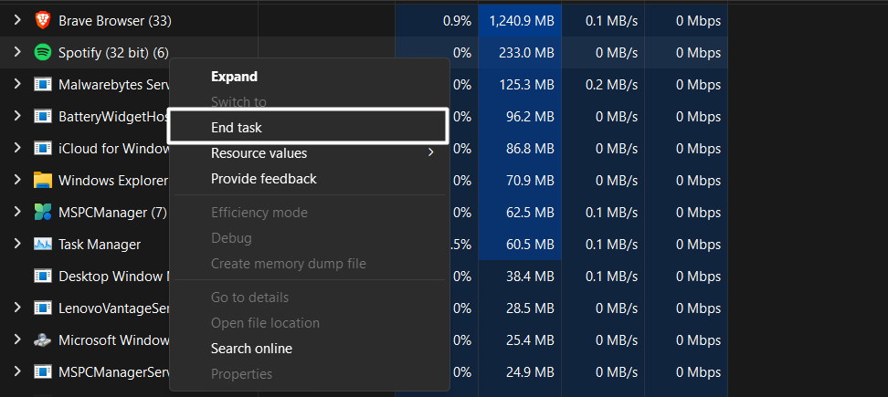 5.Na koniec kliknij prawym przyciskiem myszy program w plikuMenedżer zadańi wybierzZakończ zadaniez menu wyświetlanego prawym przyciskiem myszy.
