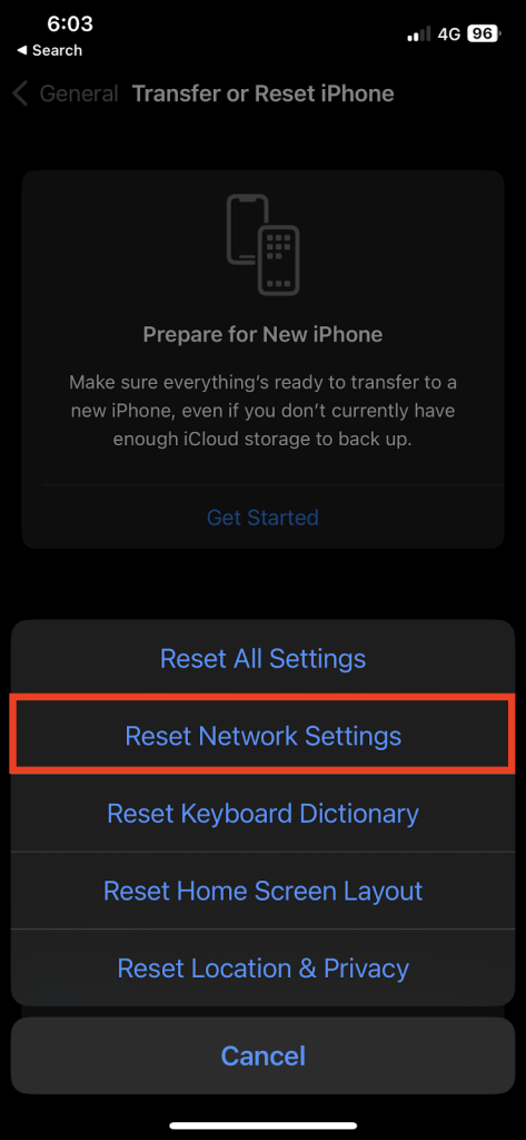 Jeśli którakolwiek z wymienionych metod nie zadziałała, a nadal masz do czynienia z SOS tylko na swoim iPhonie, całkowite zresetowanie ustawień sieciowych załatwi sprawę. Jedyną wadą jest to, że usuwa zapisane hasła Wi-Fi, urządzenia Bluetooth itp. Aby zresetować ustawienia sieciowe, wykonaj poniższe czynności: –