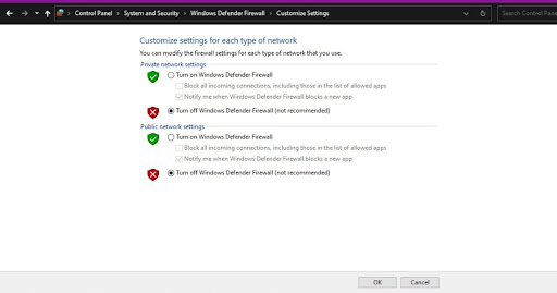 - WybieraćWłącz zaporę systemu Windows Defender(zarówno dla ustawień sieci prywatnej, jak i publicznej).