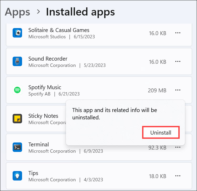 3.Przewiń listę zainstalowanych aplikacji, zlokalizujMuzyka Spotify, kliknij trzy kropki i wybierzOdinstaluj.