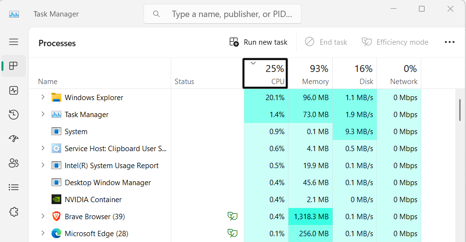 2.wAplikacja Menedżer zadań, kliknijProcesoropcja filtrowania zadań według wysokiego lub niskiego zużycia procesora.