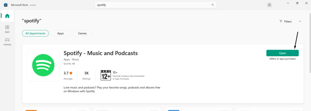 Settings App > Apps > Installed Apps > Search for Spotify > Click Three Dots > Uninstall1.Po odinstalowaniu aplikacji Spotify otwórz natywnąSklep Microsoftuna komputerze z systemem Windows 11.