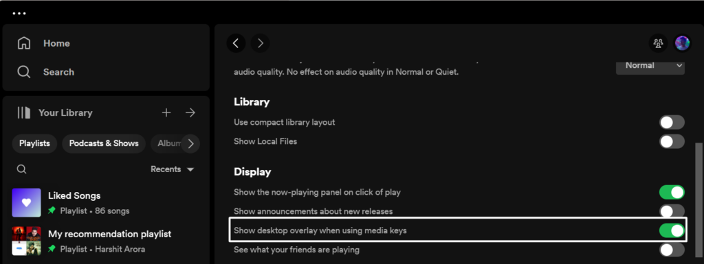 Może się zdarzyć, że funkcja nakładki jest wyłączona w ustawieniach aplikacji Spotify i dlatego nakładka nie działa na komputerze z systemem Windows 11. W takim przypadku sugerujemy, aby upewnić się, że jest ona włączona w ustawieniach. Upewnij się więc, że to samo, wykonując poniższe kroki:
