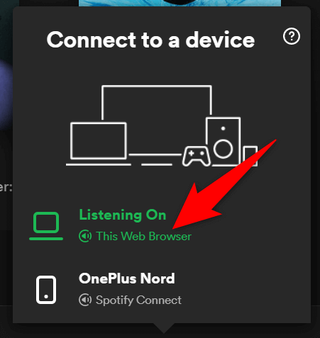 Spotify pozwala ręcznie wybrać urządzenie do odtwarzania muzyki. Upewnij się, że Spotify jest skonfigurowany tak, aby używał Twojej przeglądarki internetowej do odtwarzania muzyki. Jeśli tak nie jest, zmień urządzenie, a odtwarzacz internetowy zacznie działać.