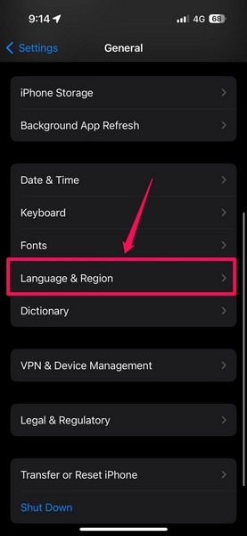 3.Na następnej stronie dotknijJęzyk i regionopcja.