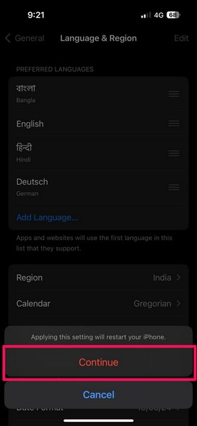 7.Aby zastosować tę zmianę,musisz ponownie uruchomić iPhone'a. Więc dotknijPrzycisk Kontynuujaby ponownie uruchomić urządzenie.