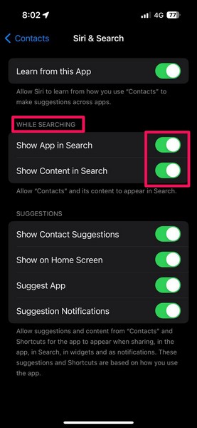 4. Włącz kontakty dla wyszukiwania Spotlight na swoim iPhonie