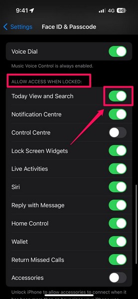 4.Przewiń w dół doZezwól na dostęp po zablokowaniusekcję i upewnij się, że przełącznik dlaDzisiaj Zobacz i wyszukajopcja jestwłączonyna Twoim urządzeniu.