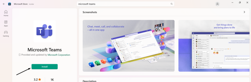 1.OtwórzAplikacja Microsoft Storei wyszukajAplikacja Microsoft Teamskorzystając z pola wyszukiwania.