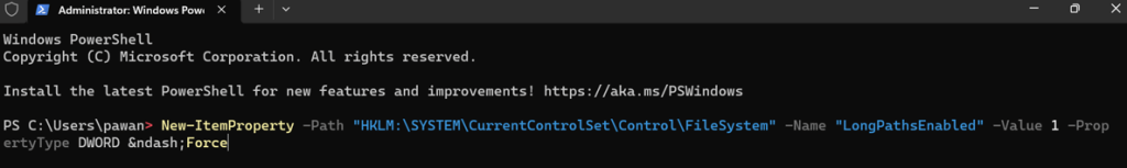 New-ItemProperty -Path "HKLM:SYSTEMCurrentControlSetControlFileSystem" -Name "LongPathsEnabled" -Value 1 -PropertyType DWORD –Force