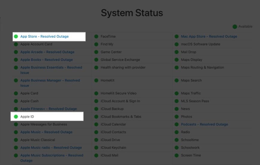 Dla pewności udaj się doStrona stanu systemu Applei sprawdź, czy serwer App Store jest dostępny (z zielonym kółkiem obok). Jeśli widzisz wskaźnik stanu w innym kolorze, oznacza to, że App Store nie działa teraz poprawnie.