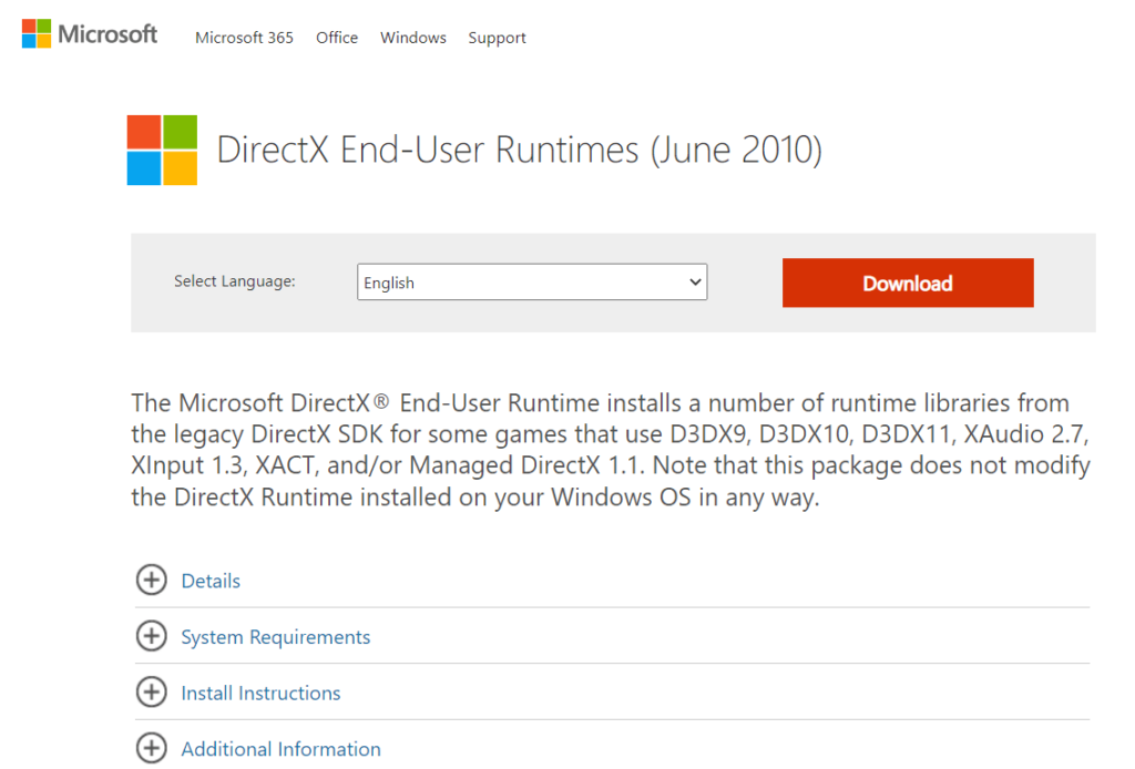 Krok 1:PobieraćŚrodowisko wykonawcze DirectX dla użytkownika końcowegozwitryna Microsoftu.