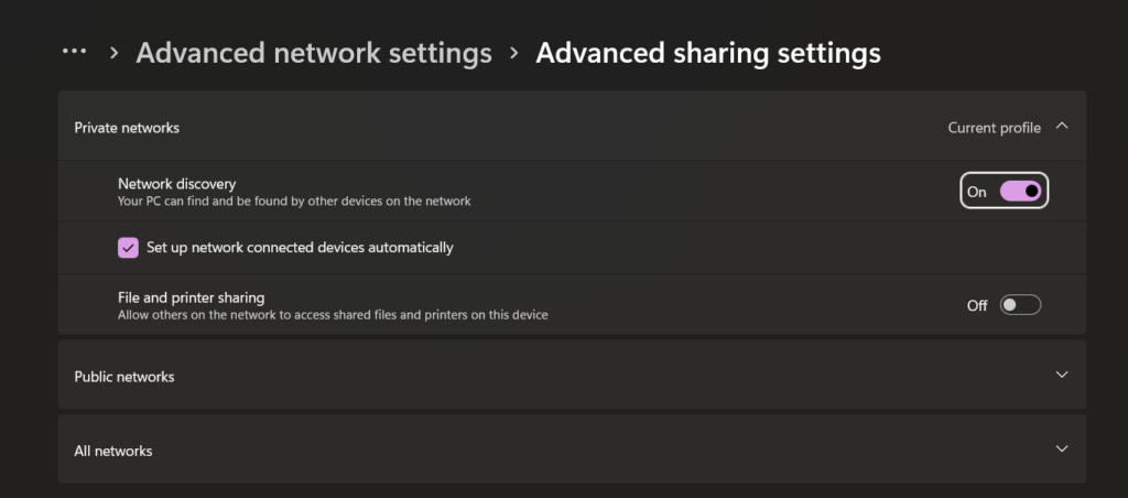 - W sekcji „Zaawansowane ustawienia udostępniania” wybierz opcję „Włącz wykrywanie sieci”.