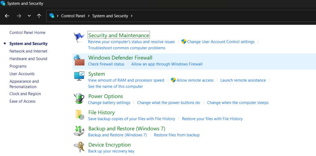 - Otwórz „Panel sterowania”, wybierz „System i zabezpieczenia”, a następnie wybierz „Zapora systemu Windows Defender”.