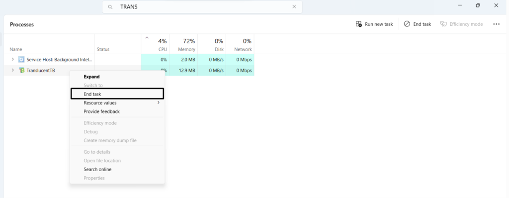 2.wMenedżer zadańokno, znajdźProgram TranslucentTBi po prostu kliknij go prawym przyciskiem myszy.