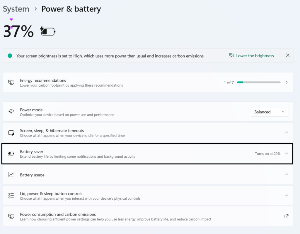 2.wZasilanie i bateriaokno, rozwińOszczędzanie bateriisekcję i kliknijWyłącz teraz.