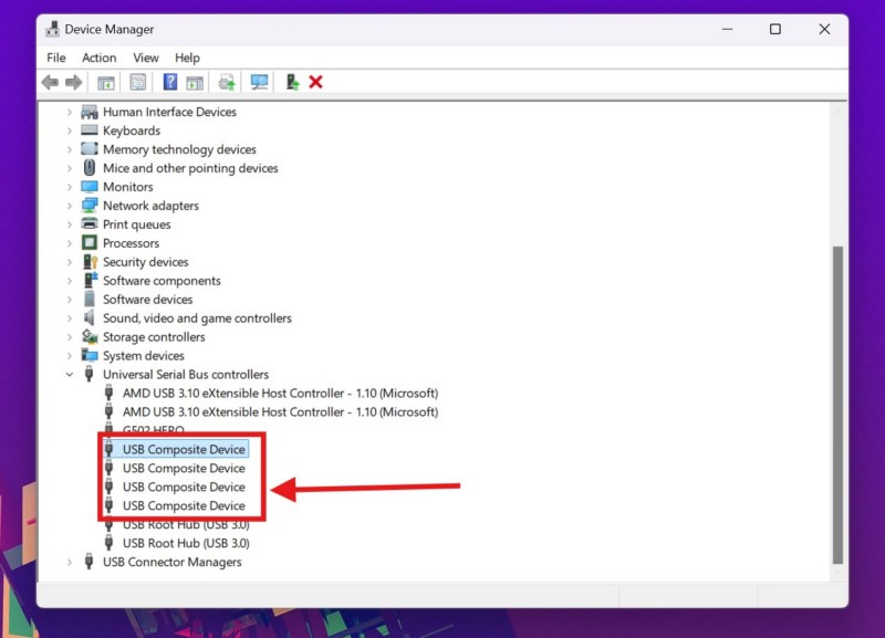 1. Skorzystaj z kroków 1-3z poprzedniej poprawki(Poprawka nr 4)Dozlokalizuj sterowniki urządzeń USB Compositew sekcji Kontrolery uniwersalnej magistrali szeregowej w oknie Menedżera urządzeń.