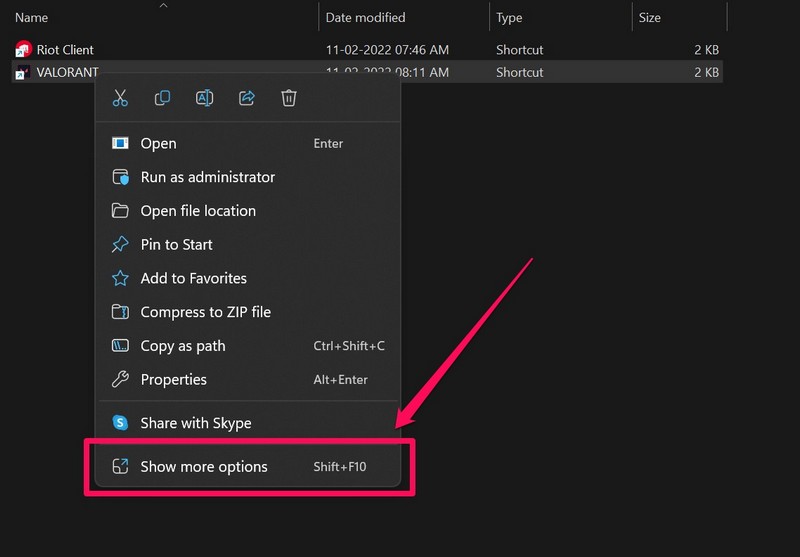 3.Po otwarciu lokalizacji pliku w Eksploratorze plikówkliknij prawym przyciskiem myszy plik wykonywalnydla Valorant i kliknijWłaściwościprzycisk.