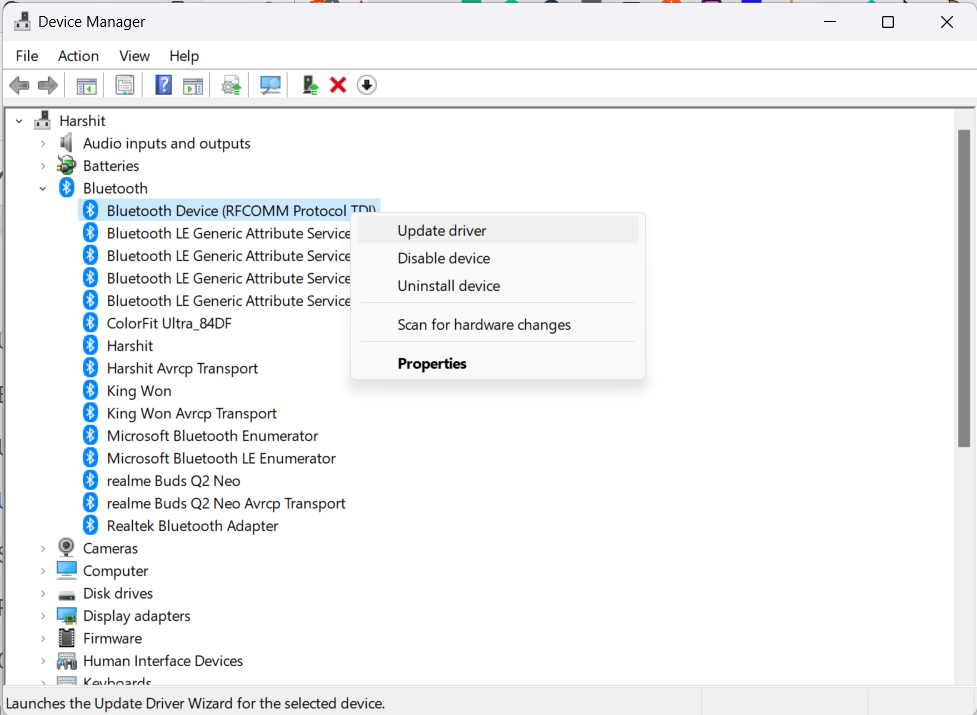 Niektórzy użytkownicy systemu Windows 11/10 wykorzystali powyższą metodę do utworzenia pliku DMP. Kilku użytkowników zgłosiło, że w ich pliku DMP za winowajcę problemu uznano sterowniki Bluetooth. Na szczęście aktualizacja sterowników Bluetooth rozwiązała problem i możesz spróbować tego samego. Wykonaj poniższe kroki, aby zaktualizować sterowniki Bluetooth z poziomu Menedżera urządzeń.