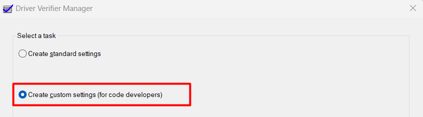 9.Zobaczysz terazMenedżer weryfikatora sterownikówokno. WybierzUtwórz ustawienia niestandardowe (dla twórców kodu)opcja.