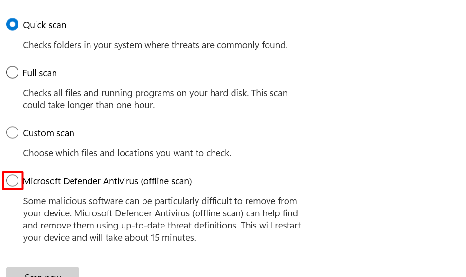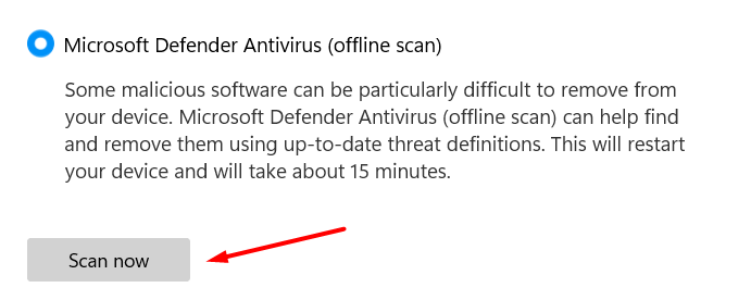 6.WybierzProgram antywirusowy Microsoft Defender (skanowanie offline)opcja.