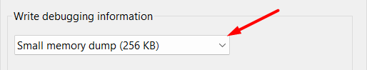 4.Wybierać theOpcja małego zrzutu pamięci (256 KB).z listy rozwijanej podNapisz sekcję dotyczącą informacji o debugowaniu.