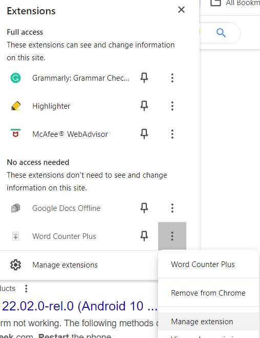 Krok 3 –Kliknij trzy pionowe kropki obok rozszerzenia i kliknij dalejZarządzaj rozszerzeniem.
