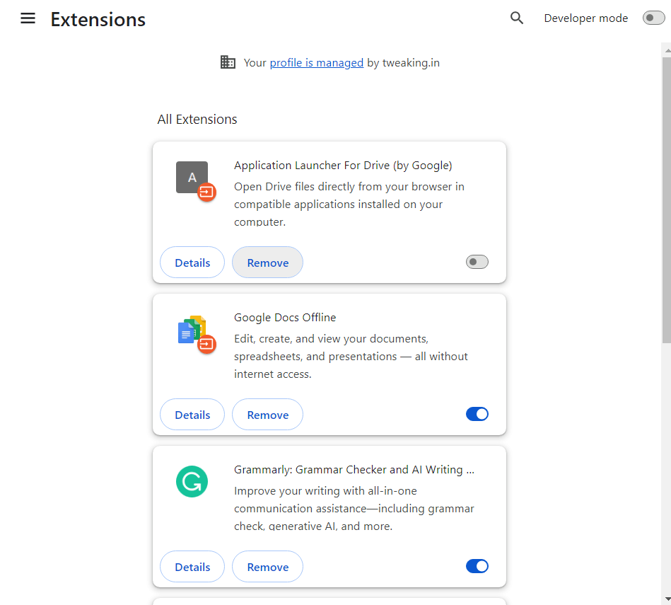 Krok 4 –Aby wyłączyć rozszerzenie, przesuń włącznik/wyłącznik w lewo. Aby usunąć rozszerzenie, przewiń w dół i kliknijUsuń rozszerzenie.