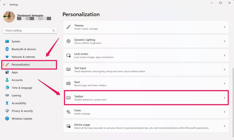 2.Idź doPersonalizacjana lewym pasku nawigacyjnym, a następnie kliknij przyciskPasek zadańopcję w prawym panelu.