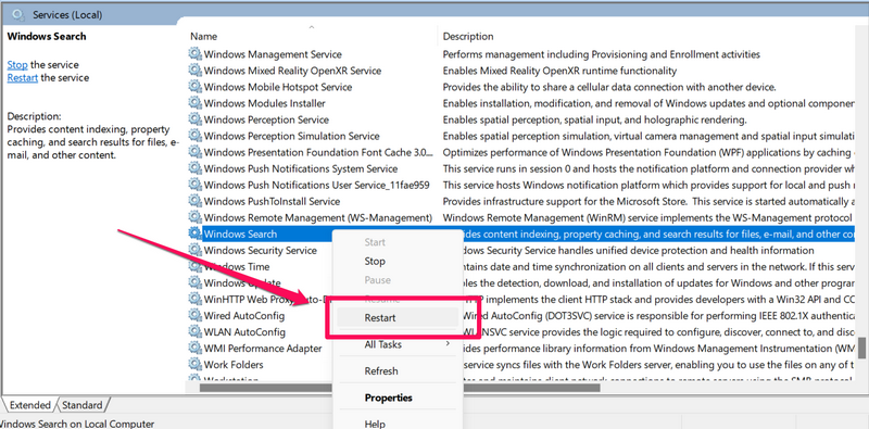 4. Uruchom ponownie usługę wyszukiwania systemu Windows