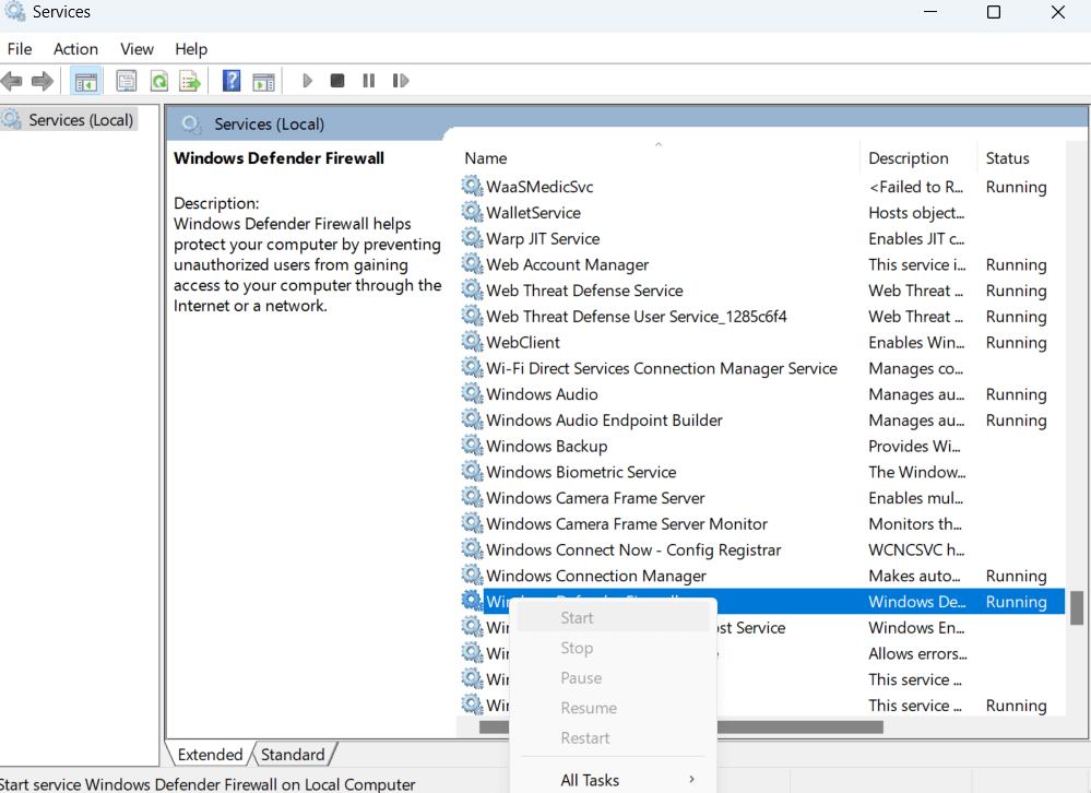 Krok 7 –LokalizowaćZapora systemu Windows Defender, kliknij go prawym przyciskiem myszy i kliknijStart.