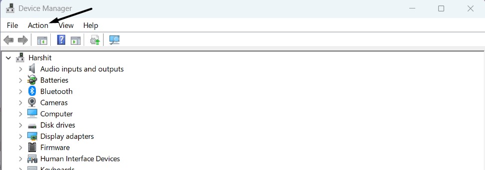 4.WybierzDziałanieopcja w górnym menu nawigacyjnym wMenedżer urządzeń aplikacjaokno.