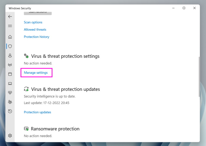 1.OtwórzAplikacja do ochrony przed wirusami i zagrożeniamiw swoim systemie i wybierz opcjęZarządzaj ustawieniamiopcja.