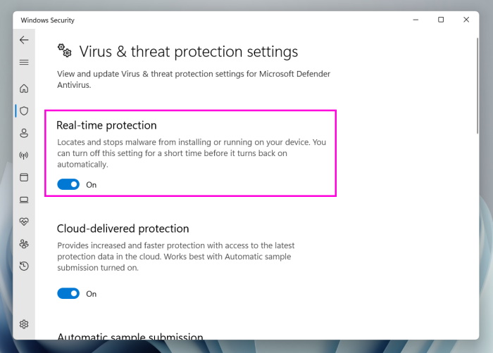 2.Wyłącz przełącznik poniżejOchrona w czasie rzeczywistymaby wyłączyć program antywirusowy w swoim systemie.